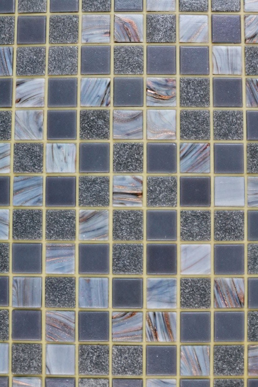 Серый микс из мозаики из экологически чистого стекла. Продается в листах, лицевой стороной идет на пленке. После укладки пленку нужно удалить, и мозаика готова к затирке. Отгрузка со склада от 10 листа. Гарантированное качество – собираем мозаику этой фабрики уже более 18 лет.